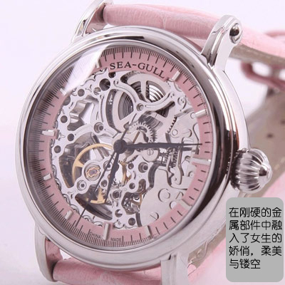 手表,無(wú)論怎么變化多少都有些男孩子氣,金屬機(jī)芯的精密構(gòu)造稍許有些刻板。海鷗的這款粉色手表則在剛硬的金屬部件中融入了女生的嬌俏,柔美與鏤空,粉色與金屬……完美碰撞