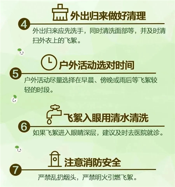 2.外出返回后應先盡快洗手,及時清掃外衣上的飛絮。