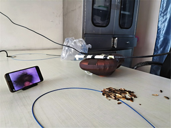 記者看到徐醫生自制的呼吸內鏡,胸部是用一個家用電動按摩枕代替的,用來能模擬人的胸部呼吸起伏;按摩枕上固定了兩個用打印紙卷成的小紙筒,用來代替氣管;屏幕是用手機代替的,用WIFI和氣管鏡鏈接,影像可以通過手機屏幕看到;內鏡手柄是徐醫生用膠泥結合真實設備形狀、重量捏制而成的。當著記者的面,徐醫生把一小半瓜子皮放入模擬人體氣管的紙筒,在手機屏幕的導航下通過氣管鏡到達異物所在位置,熟練地用異物鉗夾出異物。