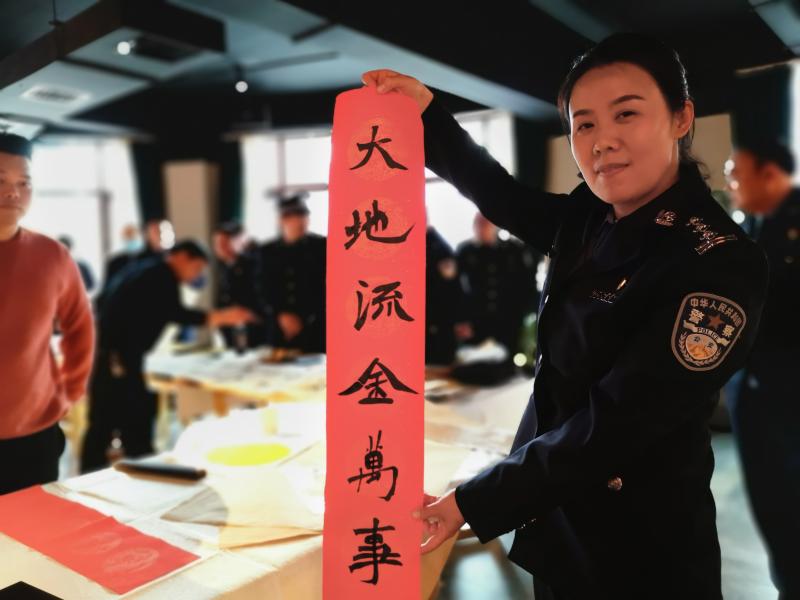 活動現場,氣氛熱烈,書法家們現場揮毫潑墨、筆走龍蛇,帶著喜迎牛年的美好祝愿。民警、輔警爭相圍觀,觀看、揣摩書法家們蒼勁有力的書法作品,房間內洋溢著濃郁的節日氣息。