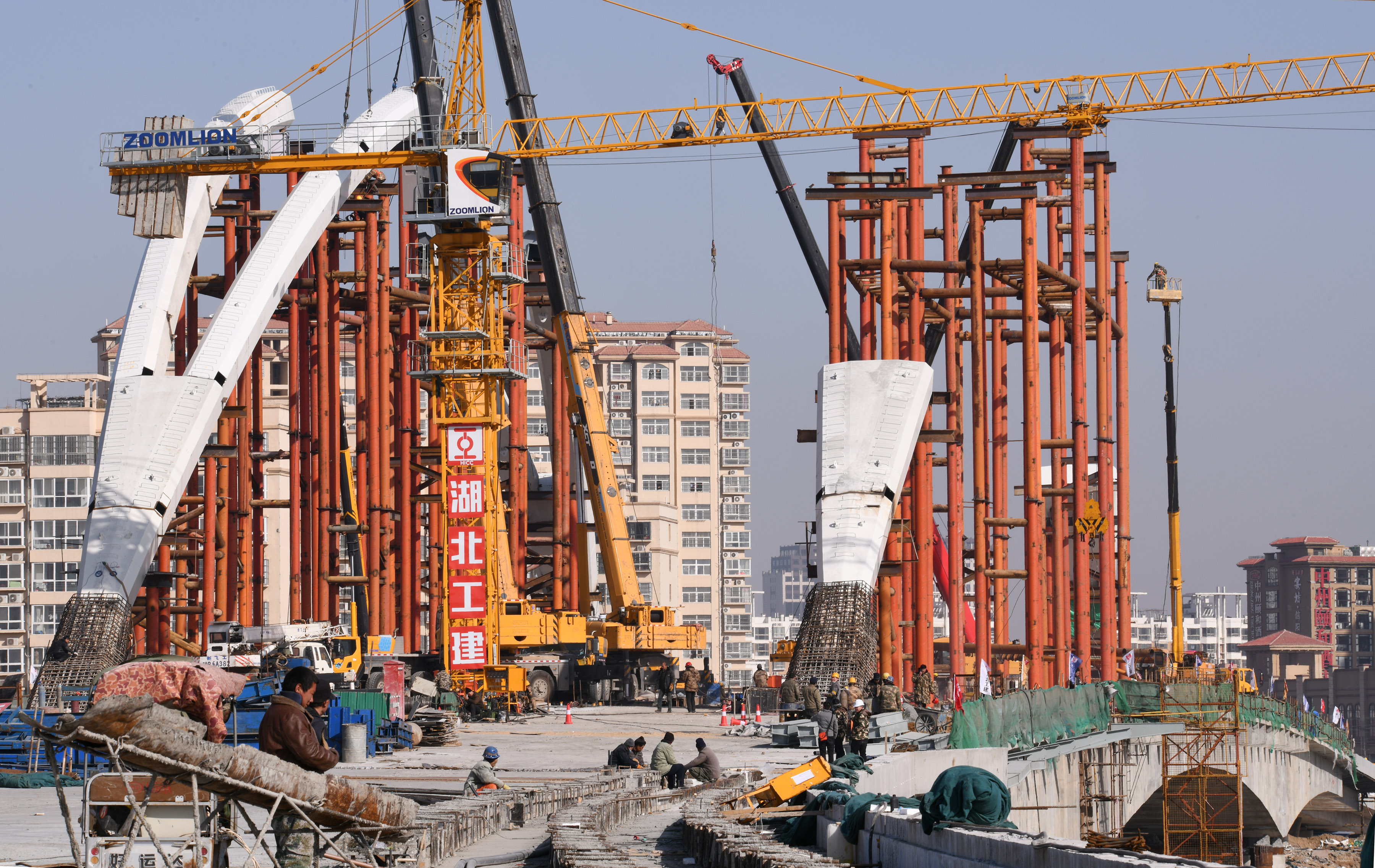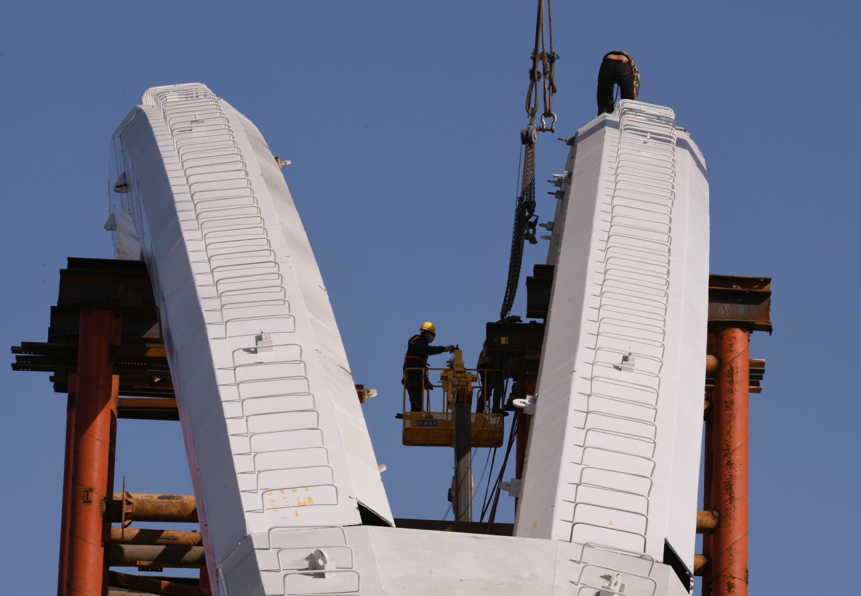 “一輪明月照古城”是中原路跨沙潁河大橋在諸多跨沙潁河大橋中獨居特色的風情。眼下,中原路跨沙潁河大橋合攏之后,橋面建設處于緊鑼密鼓之中,并開始進入安裝“月亮”施工階段。記者在施工工地看到,吊車往來,吊臂上下吊裝著材料,隨著工人們忙碌地焊接、安裝,“月牙”已經乍現。