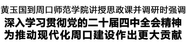 思政課上,周口師范學院校長張寶強介紹了學校建設發展情況,部分教師和學生代表結合工作學習實際,暢談學習貫徹黨的二十屆四中全會精神的認識體會,分享在深化思政課改革創新、推進校地合作方面的實踐探索。黃玉國認真聽取發言,就師生關心關注的問題與大家進行交流研討。黃玉國指出,黨的二十屆四中全會,是在向第二個百年奮斗目標進軍的新征程上召開的一次十分重要的會議,是乘勢而上、接續推進中國式現代化建設的又一次總動員、總部署。要學習好、宣傳好、貫徹好黨的二十屆四中全會精神,深刻領悟“兩個確立”的決定性意義,堅決做到“兩個維護”,切實把思想和行動統一到全會精神上來,推動黨中央決策部署在周口落地落實、見行見效。