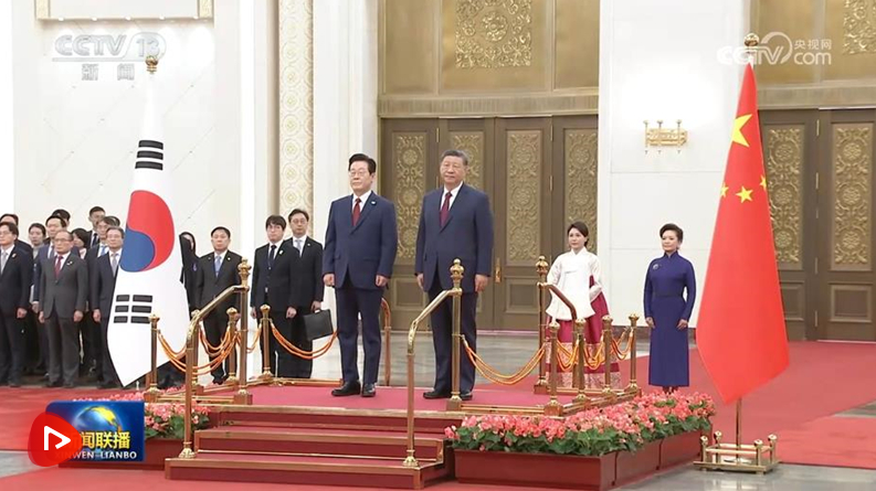 會談前,習近平和夫人彭麗媛在人民大會堂北大廳為李在明和夫人金惠景舉行歡迎儀式。