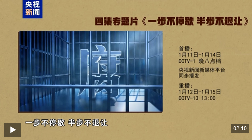 由中央紀委國家監委宣傳部與中央廣播電視總臺央視聯合攝制的電視專題片《一步不停歇 半步不退讓》,將于1月11日至14日在中央廣播電視總臺央視綜合頻道晚8點檔播出,央視新聞新媒體平臺同步播發。