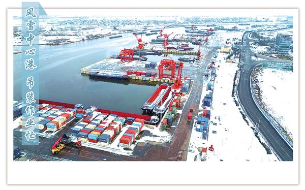 1月21日上午,白雪裝點(diǎn)下的周口中心港范營(yíng)作業(yè)區(qū)一片繁忙景象。碼頭上,運(yùn)輸車輛往來穿梭,集裝箱吊裝作業(yè)有序進(jìn)行,呈現(xiàn)了新年伊始港口生產(chǎn)的蓬勃?dú)庀蟆?/p>