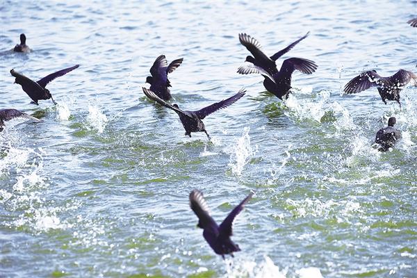 11月16日,在淮陽龍湖國家濕地公園,一群國家二級保護動物白骨頂雞在此集結。