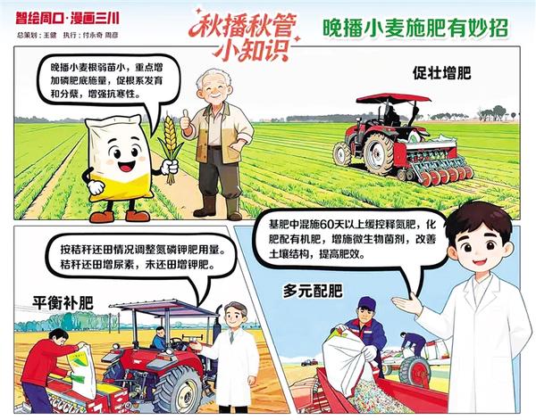 今年土壤養分流失大,晚播小麥根弱苗小。專家建議,底肥增磷肥促根壯苗,根據秸稈還田情況調整氮磷鉀肥用量,秸稈還田增尿素,未還田增鉀肥。
