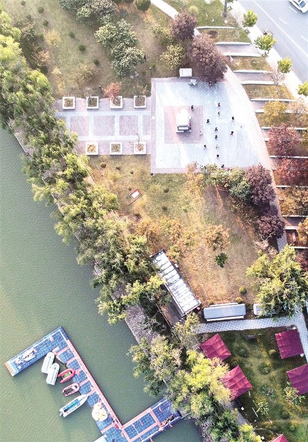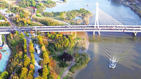 11月5日下午,一只小艇劃開碧波,從大慶路橋下駛過,和被秋色染得五彩斑斕的沙潁河公園交相輝映,使得沙潁河更加靈動而秀美。