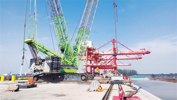 秋雨初霽,10月22日的周口港小集作業區碼頭顯得格外敞亮。堆場6臺高高的場橋(龍門起重機)如塔聳立,一灣碧水映襯著碼頭上的4臺橘紅色岸橋(集裝箱起重機),大港氣勢令人仰視。