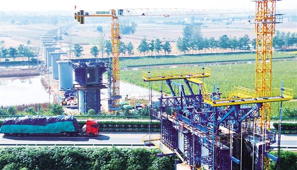 10月22日,周口中心港集疏運(yùn)鐵路專用線(簡稱專用線)控制性工程——跨寧洛高速特大橋正緊張施工。